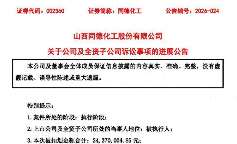 继2025年业绩增亏、实控人部分持股遭冻结后,近日,同德化工(002360)及其全资子公司在涉及的一起融资租赁合同纠纷案中再遭重击。